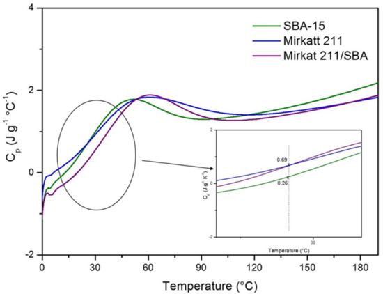 Heat capacity measured by modulated DSC (MDSC) for SBA-15, Mirkatt 211, Mirkat 211/SBA-15.