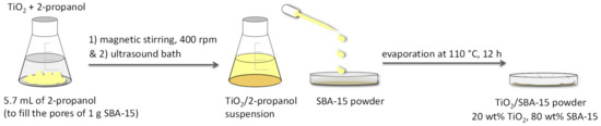 According to Figure 10, TiO2 was added to the suitable amount of 2-propanol, that was calculated on the basis of the volume of liquid necessary and sufficient to fill all the pores of the silica support (1 g of SBA-15: 5.7 mL of solvent).