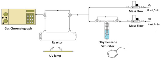 The photocatalytic activity in gas phase VOC abatement was evaluated by considering the ethylbenzene (EB) molecule oxidation as model reaction. In particular, the photoactivity was evaluated using the experimental apparatus reported in Figure 11.