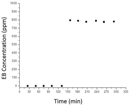 A characteristic reaction profile is shown in Figure 12, where two distinct reaction steps are clearly visible. In the former one the concentration of detected EB is zero, indicating that all molecules that reach the surface of the catalyst are absorbed: this process continues until the full coverage of the available superficial sites is reached and this evidence was observed also in the blank tests in the absence of irradiation. Moreover, the temporal extent of absorption is an indication of the total amount of absorbed organic molecules. Nonetheless, in this initial phase EB is not only adsorbed, but also partially converted to CO2 and H2O, however adsorption kinetics is predominant on the whole process. Indeed, the TiO2-containing photocatalyst progressively darkened, due to cracking of the organic compound under UV light irradiation.