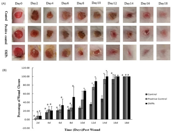 Effect of SMPs on wound healing. (A) Representative photos of each group of mice. (B) percentage of wound closure (calculated once every two days). Different superscript letters on the same day indicated significant differences between the groups (p < 0.05) and insignificant different (p > 0.05), respectively, * indicates a very significant difference (p < 0.01).