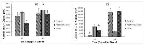 Effect of SMPs on inflammatory factors in wound skin tissue. (A) The content of IL-6 in the experimental group mice at three and five days after modeling. (B) IL-10 content in mice of the experimental group at three and five days after modeling. Different and same letters within the same row indicate significant (p < 0.05) and insignificant different (p > 0.05), respectively, * indicates a very significant difference (p < 0.01).