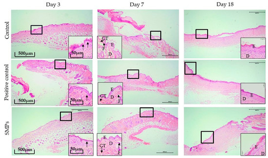 The effect of SMPs on skin wound healing in mice was studied microscopically using H&E staining in Figure 4. On day 3 of the experiment, in the negative control group, the positive control group and the SMPs group showed a weaker inflammatory response. On day 7 of the experiment, there were still few inflammatory cells in the negative control group. The epidermal layer of the wound was incompletely healed and the collagen fibers in the dermis were sparse and few. However, in the positive control group and SMPs group, no inflammatory reaction was observed, and the wound formed a coherent epidermis, and more granulation tissue formed in the dermis. On day 18 of the experiment, compared with the negative control group, the repair of epidermis and dermis in the positive control group and SMPs group resembled normal skin.