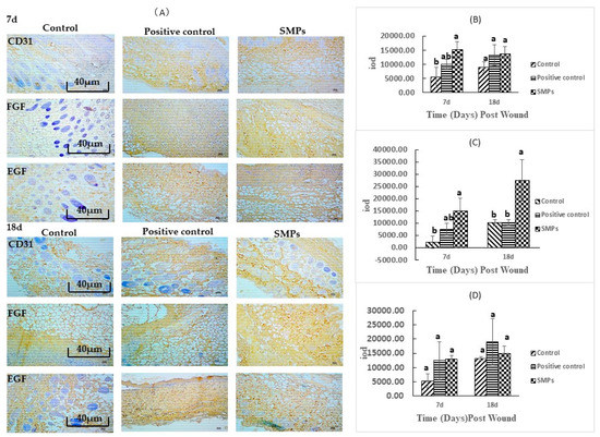 As shown in Figure 5, SMPs promoted the expression of CD31, FGF, and EGF compared with the control group. On day 7, SMPs showed significant differences in promoting CD31 and FGF expression (p < 0.05). On day 18, the experimental groups showed no significant difference in the expression of CD31 and EGF, whereas, the SMPs group showed significant upregulation of FGF (p < 0.05).