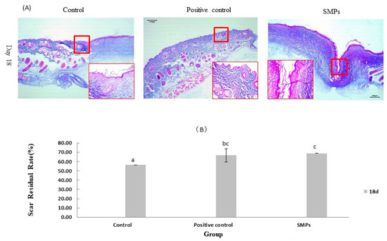 Effects of SMPs on collagen bundles and epithelialization. (A) Representative images of Masson stained wound sections (10× and 40×). Sliced blue indicates collagen, red indicates cytoplasm and muscle fibers. (B) Scar residual rate. Different and same letters within the same row indicate significant (p < 0.05) and insignificant different (p > 0.05), respectively.