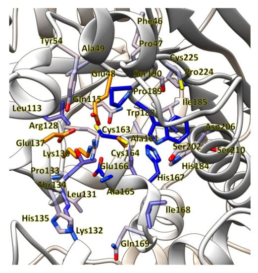 The residues participating in the catalytic triad (Glu48, Lys130, Cys164) and the second catalytically important glutamate residue (Glu137) are shown in orange. Amino acid residues which are located at a distance of less than 10 Å from Cys164 are shown in accordance with their distance to Cys164 in decreasing shades of blue. The model was prepared for the present study based on the structure of the nitrilase from Synechocystis sp. PCC6803, PDB 3WUY, using the program Yasara []. The resulting homology model was refined by the “md-refine macro” using the default parameters.
