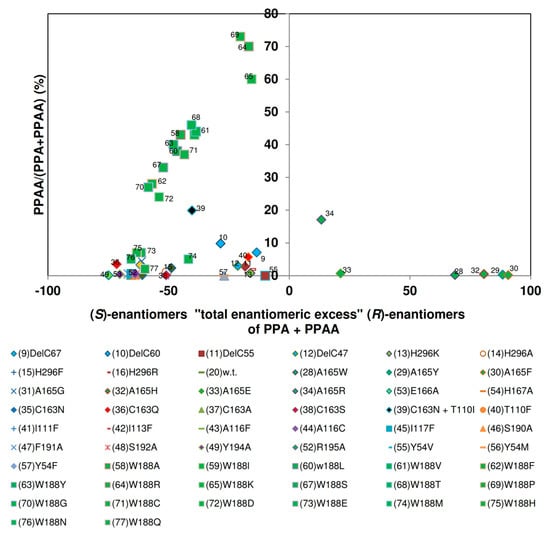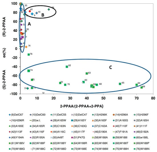 The second group (Figure 9, group B) encompassed variants which formed 3%–17% of 2-PPAA and showed compared to the wild-type enzyme a slightly enhanced enantioselectivity for the formation of (R)-2-PPAA with ee-values of about 80%.