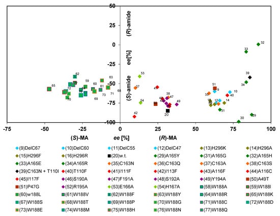 To gain additional information, two plots were produced which related the relative amounts of amides formed with the enantiomeric composition of the amides (Figure 8 and Figure 9). The graphical representation of the data for the formation of mandelamide from (R,S)-MN demonstrated that the enantiomeric composition of the amides was largely independent from the relative amounts of amides formed. Thus, variants were compared which produced between 2%–94% of mandelamide. Nevertheless, almost consistently (S)-mandelamide was preferentially formed with ee-values of 40%–85% (Figure 8). These experiments established that the mutations resulting in the formation of increased amounts of mandelamide from (R,S)-mandelonitrile did only marginally influence the enantioselectivity.