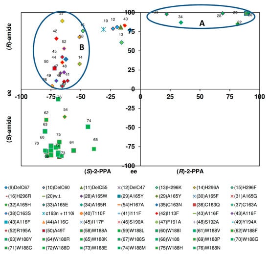 The nitrilase variants belonging to these three groups generally exhibited with (R,S)-mandelonitrile a more pronounced tendency towards the formation of the (R)-acids than with (R,S)-2-PPN. Thus, almost all variants belonging to the group A, produced (R)-MA with a higher ee-value than (R)-2-PPA. This effect was even more pronounced for the variants clustering in groups B and C which formed preferentially (R)-MA, but (S)-2-PPA (Figure 6).