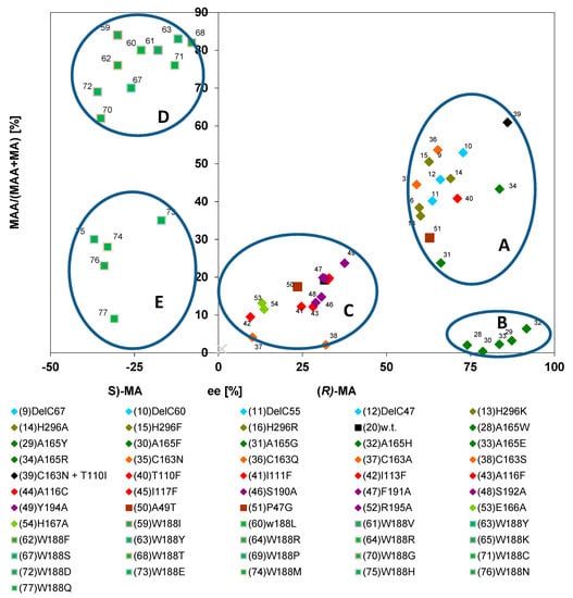 The largest group of variants (Figure 6, group C) behaved similar to the wild-type enzyme and hydrolysed (R,S)-mandelonitrile with a low degree of enantioselectivity preferentially to (R)-mandelic acid and (R,S)-2-PPN preferentially to (S)-2-PPA. These variants showed only a low degree of variance regarding the formation of (S)-2-PPA (ee-values of about 50%–80%), but more pronounced differences for the formation of (R)-MA (ee-values of about 10%–70%).