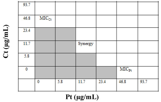 The individual MICs of Ct and Pt against S. pyogenes were 46.8 µg/mL. To determine FIC index value, a checkerboard assay was performed in which various concentration combinations of Ct and Pt (ranging from several dilutions below the MIC to twice the MIC) were assessed against S. pyogenes. As evident in Figure 1, the best FIC index for the combination (Ct + Pt) was the one with the lowest value, which was found to be 0.5.