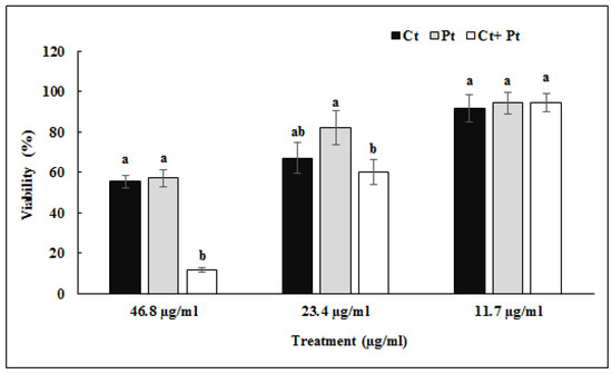 Effect of citral (Ct), phloretin (Pt), and their combination (Ct + Pt) on the viability of tonsil epithelial cells as measured by MTS assay (values are mean ± SD, n = 3). Bars (means) with different letters (a and b) are significantly different from others (p < 0.05).