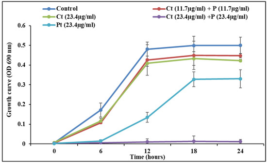 Growth curve assay was performed in microtiter plates containing BHI, bacterial inoculum, and different combinations of test compounds [i.e., sub-MIC of Ct (23.4 µg/mL), Pt (23.4 µg/mL), and their combinations Ct + Pt (23.4 µg/mL + 23.4 µg/mL), and Ct + Pt (11.7 µg/mL + 11.7 µg/mL)]. One of the controls included an equivalent reaction mixture containing 0.1% DMSO. The plates were incubated at 37 °C, statically. The culture’s spectrophotometry readings (OD690) were recorded, and the survival rates were obtained at predetermined time intervals of 0, 6, 12, 18, and 24 h after incubation [28]. All experiments were carried out in triplicate.