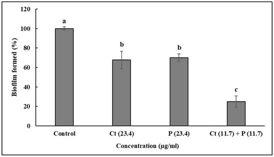 Effect of citral (Ct: 23.4 µg/mL) and phloretin (Pt: 23.4 µg/mL) and their combination (Ct + Pt: 11.7 µg/mL + 11.7 µg/mL) on biofilm formation when the bacteria was grown for 24 h in the presence of molecules. Bacteria grown under similar conditions without any test molecules were taken as the control. Data represent mean ± SD from three independent experiments. Bars (means) with different letters (a–c) are significantly different from others (p < 0.05).
