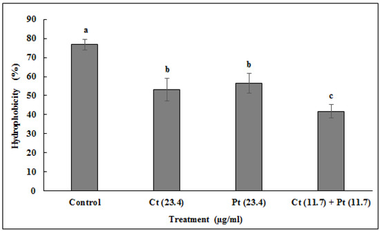 Inhibitory effect of citral (Ct: 23.4 µg/mL) and phloretin (Pt: 23.4 µg/mL) and their combination (Ct + Pt: 11.7 µg/mL + 11.7 µg/mL) on S. pyogenes cell surface hydrophobicity. The experiments were carried out in triplicate (values are mean ± SD, n = 3). Bars (means) with different letters (a–c) are significantly different from others (p < 0.05).