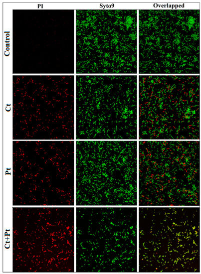 CLSM revealed the impact of the compounds on the ability of S. pyogenes to thrive (Figure 6). The mixture of the two fluorescent nucleic acid stains used, i.e., PI (red/yellow, dead cells) and SYTO 9 (green, live cells), revealed that Ct + Pt in combination could cause membrane damage in S. pyogenes [33], as demonstrated by the existence of red/yellow fluorescent bacterial cells within the Ct + Pt treated biofilm. The CLSM images revealed that the membrane of S. pyogenes was compromised in the treated sample, whereas the control sample showed the aggregated cells, as was evident by the presence of many green-fluorescent bacteria. Based on these results, Ct + Pt appears to be an ideal combination to prevent S. pyogenes infection. Adil et al. [34] conducted similar microscopy analysis using plant-based molecule eugenol and observed a similar pattern in S. mutans.