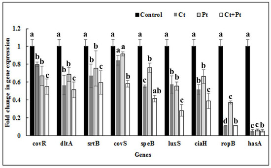 The genes responsible for the expression of RopB and HasA protein were profoundly repressed (Figure 6). ropB expresses a transcriptional regulating protein that influences other genes that play a critical role in virulence, stress response, and metabolism in these bacteria [35]. The gene hasA synthesizes hyaluronic acid (HA) capsule that helps S. pyogenes to evade the immune response of the host [36]. Betulin, a plant-based compound, showed a similar impact on ropB gene. However, the repression of hasA was a mere 9% reduction, which contradicted the results of this study [37]. The genes of the covRS TCS pathway, namely covR (repressor) and covS (sensor kinase), were moderately down-regulated in the presence of Ct + Pt. covRS TCS pathway influences nearly 15% of genes, including those playing a pivotal role in quorum sensing and hyaluronic acid synthesis in S. pyogenes [23,36]. Ct and Pt possess antioxidant properties [38,39]. The oxidative stress response in S. pyogenes requires the expression of the gene CiaH. Therefore, the influence of Ct and Pt was assessed individually as well as in combination. Ct + Pt treatment was found to down-regulate ciaH expression significantly. This gene is believed to participate in the early stages of infection, but it is not important in the later stages of infection that leads to its virulence [40].