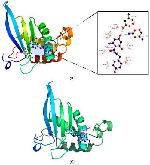 (A). The binding pattern of citral within the active site of LuxS. (B). The binding pattern of phloretin within the active site of LuxS. (C). The cluster showing the binding pattern of both citral (magenta) and phloretin (blue) within the active site of LuxS.