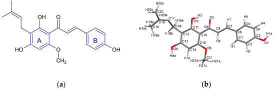 (a) Scheme of xanthohumol (XN) structure; (b) atom numbering in the XN cocrystals. For more than one XN molecule in the asymmetric part of a unit cell, the suffixes A, B, C, and D were added, see crystallographic information files (CIFs) in the Supplementary Materials.