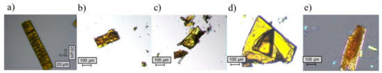 Micrographs of cocrystals obtained with a Nikon Eclipse 50iPOL microscope with the charge-coupled device (CCD) camera. (a) XN, (b) XN−NIC, (c) XN−GA, (d) XN−AC, and (e) XN−CF.