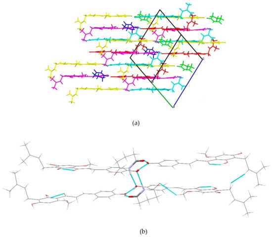(a) Altered layers of AD, BC (yellow A, magenta D, red B and violet C) of XN molecules in XN−GA; (b) hydrogen bonds in a supramolecular ring structure, the graph set notation . No symmetrically equivalent XN molecules in the crystal structure are represented by different colors.