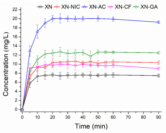 It has been reported that handling of xanthohumol is difficult since the poor solubility in water (1.3 mg/L at 23 °C [2]) is a major drawback in reproducibility results in the pharmacological studies both in vitro and in vivo [35]. In this way, the application of UV–Vis spectroscopy to compare the solubility of XN with its cocrystals was not possible in pure water, and therefore the solubility experiment was evaluated in a 50:50 (v/v) ethanol–water solution in accordance to similar cases [36,37]. Due to the relative high solubility of used coformers in aqueous media (several orders of magnitude higher than the value reported for XN), it is suggested that the dissolution profile of XN would be improved after the cocrystals formation. The result of solubility determination of XN and its cocrystalline phases is presented in Figure 10. As expected, all cocrystals investigated exhibit the improvement of solubility, with the largest solubility enhancement demonstrated by the XN−AC cocrystals, which is ca. 2.6 times greater as compared to intact XN. The solubility curve of XN with the maximum solubility value of 7.6 mg/L subsequently reaches a plateau after 30 min. It is shown that the solubility of XN is in the same range as determined by Stevens et al. with 3.5 mg/L (in 5% ethanol) [2]. However, the ‘spring and parachute’ effect described by Guzmán et al. [38], which is commonly observed in case of the enhanced solubility of drug cocrystals did not occur in the study reported herein. Finally, the solubility profiles of pure XN and its cocrystals revealed that the approach of cocrystallization with successful solubility modification was achieved with maximum solubilities of 9.98 (±0.58), 10.54 (±0.98), 12.73 (±0.67), and 20.07 (±0.70) mg/L demonstrated by the XN−CF, XN−NIC, XN−GA, and XN−AC cocrystals, respectively.
