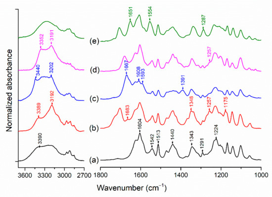 FTIR spectra of (a) xanthohumol, and the investigated cocrystals: (b) XN−GA, (c) XN−AC, (d) XN−NIC, and (e) XN−CF.