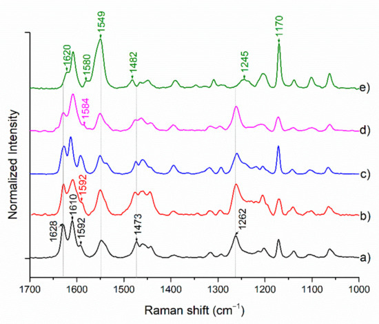 The comparison of the Raman spectra of target cocrystals and the starting materials showed the spectra to differ distinctly in the C = C and C = O stretching region. It can be seen from Figure 12 that the vibrational modes of XN (in the form of single crystal) in the spectra range 1700–1520 cm−1 have strong bands in both Raman and FTIR spectra at the same time. Except for one exception (XN−CF, Figure 12e), the intense bands at 1628 cm−1 and 1610 cm−1 are slightly shifted toward lower frequencies in the Raman spectra of cocrystals. Moreover, the ratio of these intensities, to a large extent, remains constant only for the XN−GA cocrystal. Additionally, in the region discussed above, the spectrum of the XN−GA cocrystal has the most broadened bands which is related to the six different arrangements of XN molecules in an asymmetric part of the unit cell. For other cocrystals an increase in the intensity of the band at ca. 1628 cm−1 in favor of the second one is observed. This effect is observed in the case of the XN−CF cocrystal, and the downshift of this band is the largest (by 8 cm−1) with a parallel increase in the intensities of two bands at 1549 and 1170 cm−1. This can be explained by the fact that in the molecular arrangement of XN−CF there are both weak XN interlayer hydrogen bond interactions and π–π stacking. This can be also seen in the region of bending vibrations of the phenyl ring of XN since two intensive bands at about 1470 and 1260 cm−1 are not present in the spectrum of XN−CF.