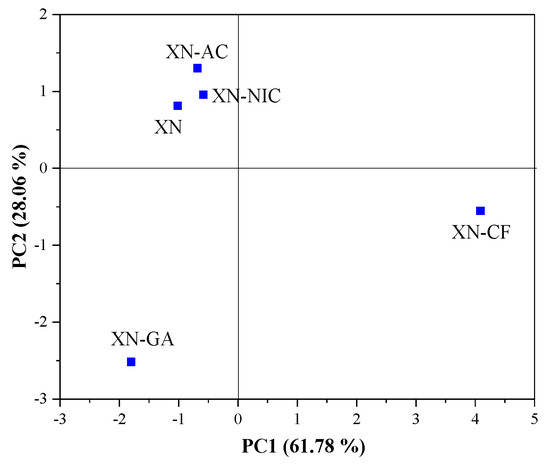Figure 13 presents the PCA score plot of PC1 vs. PC2 showing the significant cumulative percentage of total variance (90%). PC1 represents 61.78% of the explained variance and PC2 accounts for 28.06%. These two components distinguish the three groups. The XN−AC and XN−NIC cocrystals and XN create a cluster at the top of the left hand side of the plot and correlate negatively with PC1 and positively with PC2 while XN–CF and XN–GA are separated from others and create two different clusters. The other combinations of the first three PCs (PC1 vs. PC3 and PC2 vs. PC3) are presented in Figure S7a,b. The addition of the third principal component (7.43% of total variance) facilitates discrimination between the cocrystals and the crystal form of XN, especially between the XN–NIC and XN–AC cocrystals. The PC1, PC2, and PC3 loading values for the analyzed region of the Raman spectra are presented in Figure S8. The highest values of the loading plot are located in the 1628–1550 and 1262–1170 cm−1 regions. It is worth noting that there is a correlation between the PCA score plot and the loading values [50]. The observations which are positively correlated with PC1 in the score plot have positive peaks on the PC1 loading plot, and vice versa. The peaks positively correlated with the PC1 loading factor describe XN–CF, and those negatively correlated with the PC1 loading factor delineate the other samples, respectively.