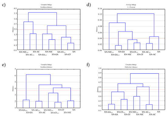 Figure 15 presents the tree diagrams obtained from the hierarchical clustering analysis using the data acquired from the Raman and FTIR spectra in the same spectral range as the PCA analysis. The use of the complete linkage and average linkage methods of agglomeration gives similar results for the data presented in the Raman spectra (Figure 15a,b). The results are cut off at about 3 units of distance and form three clusters. The XN, XN−NIC, and XN−AC cocrystals create the first cluster (2.4 unit of distance) and display the largest similarity, whereas the XN−CF and XN−GA samples create two subsequent clusters (Figure 15a). This is similar to those found in the PCA score plot (Figure 13). In the other method the results are cut off at about 0.2 units of distance (Figure 15b). In this case, the first cluster is gradually formed by the XN, XN−NIC, XN−GA, and XN−AC cocrystals. Interestingly, the XN−CF sample is grouped in a separate cluster in both methods.