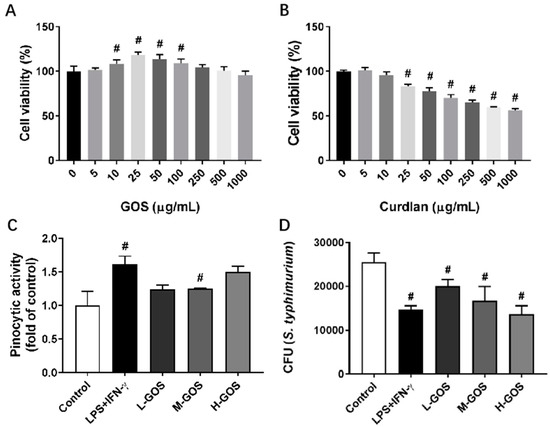 Figure 1. Cytotoxicity of (1→3)-β-d-glucan oligosaccharides (GOS) and the effects on pinocytic capacity and bactericidal function of bone marrow-derived macrophages (BMDMs). Cell viability of BMDMs was measured by MTT (3-(4,5-dimethylthiazol-2-yl)-2,5-diphenyltetrazolium bromide) assay after incubation with GOS (5–1000 μg/mL, (A)) and curdlan (5–1000 μg/mL, (B)) for 24 h. Pinocytosis of BMDMs was measured as the cellular uptake of fluorescein isothiocyanate (FITC)-dextran using flow cytometry after incubation with GOS (25−100 μg/mL) for 12 h at 37 °C (C). Bactericidal function of BMDMs was analyzed by counting the colony forming unit (CFU) of intracellular S. typhimurium after incubation with GOS (25−100 μg/mL) for 24 h (D). #—Indicated significant difference versus the control group at p < 0.05.