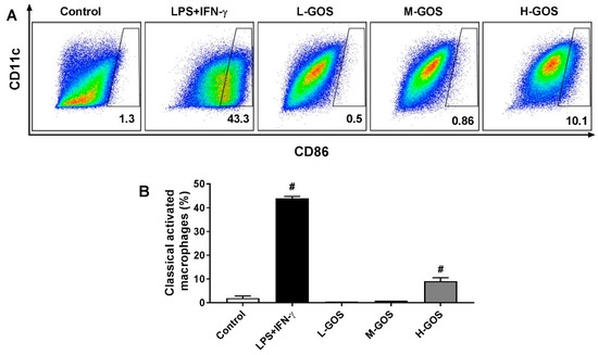 Figure 2. Effects of GOS on polarization of BMDMs. Expression of CD11c and CD86 on BMDMs cell surface (A) and accordingly the percentage of M1 phenotype macrophages (B) after GOS (25−100 μg/mL) treatment was analyzed by flow cytometry. #—Indicated significant difference versus the control group at p < 0.05.
