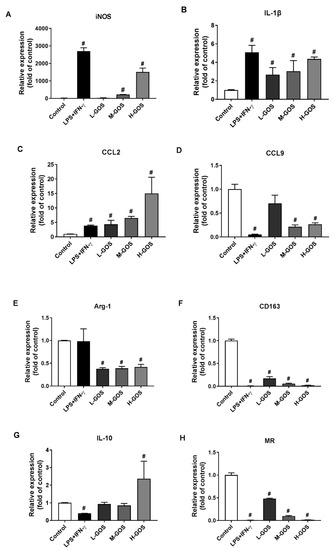 Figure 3. Effects of GOS on mRNA expression of M1 and M2 specific markers in BMDMs. The mRNA expression of M1 genes iNOS (A), IL-1β (B), CCL2 (C), CCL9 (D), as well as M2 genes Arg-1 (E), CD163 (F), IL-10 (G), and MR (H) in BMDMs were measured by real time-quantitative polymerase chain reaction (RT-qPCR) after GOS (25−100 μg/mL) treatment. #—Indicated significant difference versus the control group at p < 0.05.