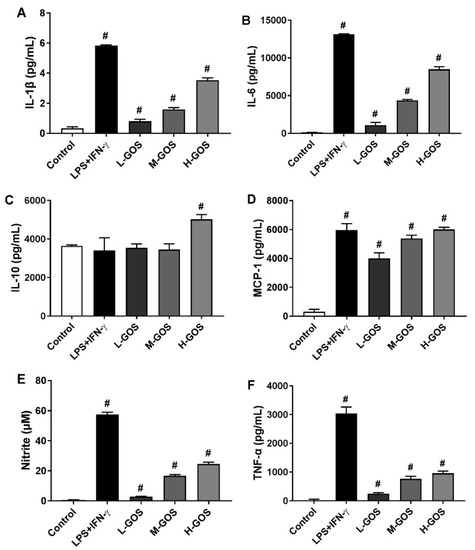 Figure 4. ELISA analysis of GOS (25−100 μg/mL) induced cytokine production of IL-1β (A), IL-6 (B), IL-10 (C), MCP-1 (D), and TNF-α (F), as well as the release of nitrite (E) in BMDMs. #—Indicated significant difference versus the control group at p < 0.05.