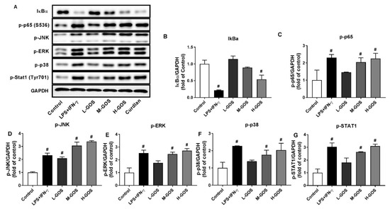 Figure 5. Western blotting of protein expression (A) and accordingly the densitometry quantification of the expressed protein bands IκBα (B), p-p65 (C), p-JNK (D), p-ERK (E), p-p38 (F), and p-Stat1 (G) in BMDMs after GOS (25−100 μg/mL) treatment. Results were expressed as the mean ± SD of three replicates. #—Indicated significant difference versus the control group at p < 0.05.