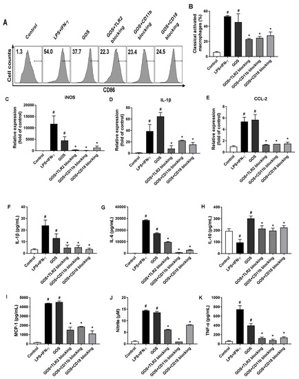 Figure 6. Effects of receptor blocking of TLR2 and CR3 (CD11b/CD18) on GOS-induced M1 marker expression, cytokines production, and nitrite release in BMDMs. Expression of CD86 on BMDMs cell surface (A) and accordingly the percentage of M1 phenotype macrophages (B) after receptor blocking and GOS (100 µg/mL) treatment were analyzed by flow cytometry. M1 marker gene expression of iNOS (C), IL-1β (D), and CCL-2 (E) were quantified by RT-qPCR. Production of cytokines of IL-1β (F), IL-6 (G), IL-10 (H), MCP-1 (I), and TNF-α (J), as well as the release of NO (K) in BMDMs were measured by ELISA kits. #—Indicated significant difference versus the control group at p < 0.05. *—Indicated significant difference versus the GOS group at p < 0.05.