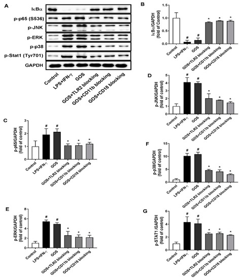 Figure 7. Effects of receptor blocking of TLR2 and CR3 (CD11b/CD18) on GOS activated mitogen-activated protein kinases (MAPKs) and nuclear factor-kappa B (NF-κB) signaling pathways. Western blotting of protein expression (A) and accordingly the densitometry quantification of the expressed protein bands IκBα (B), p-p65 (C), p-JNK (D), p-ERK (E), p-p38 (F), and p-Stat1 (G) in BMDMs pretreated with anti-CR3 (CD11b/CD18) and anti-TLR2 blocking antibodies and incubated with GOS (100 µg/mL). Results were expressed as the mean ± SD of at least three replicates. #—Indicated significant difference versus the control group at p < 0.05. *—Indicated significant difference versus the GOS group at p < 0.05.