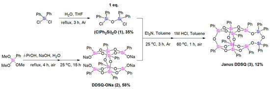 1,3-Dichloro-1,1,3,3-diphenyldisiloxane ((ClPh2Si)2O, 1) and tetrasodiooctaphenyltetracyclo- octasilsesquioxanolate (DDSQ-ONa, 2) were freshly prepared according to reported procedures [21,37]. Compound 1 (0.15 mL, 0.86 mmol) was added dropwise to a solution of (DDSQ-ONa, 2) (1.0 g, 0.86 mmol), triethylamine (0.24 mL, 1.72 mmol), and dried toluene (10 mL) over 15 min at 0 °C under argon atmosphere. Stirring was further continued for 3 h at room temperature. Subsequently, 1 M HCl (aq) (2 mL) in toluene (20 mL) was added to this solution and stirring was continued for 1 h at 60 °C. Then, the organic layer was washed with water (5 mL), aqueous sat. NaHCO3 (5 mL), and water (10 mL). The organic layer was dried over anhydrous Na2SO4, filtered, and evaporated. The crude product was obtained as the mixture between the white solid of the target compound and the viscous liquid of undesired byproduct. The target product (Rf = 0.41) was isolated by column chromatography (chloroform/hexane (4:6)) and recrystallized from a mixture of dichloromethane and 2-propanol (1:1) to obtain colorless crystals (0.15 g; 12% yield).