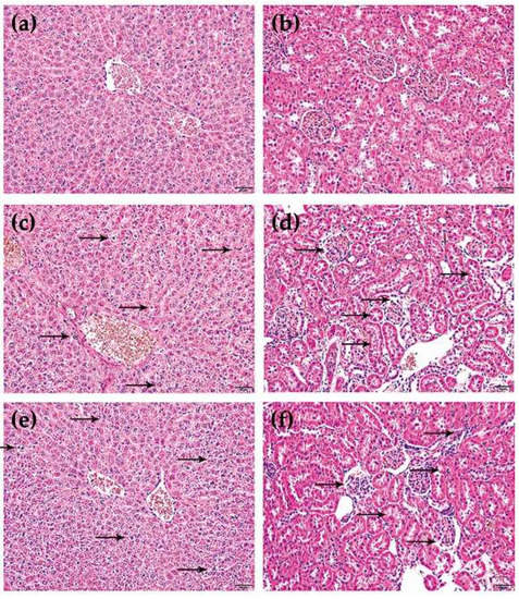 The blood samples were collected from the femoral vein in a tube without an anticoagulant. The whole blood of the rats was centrifuged at 1744× g for 15 min at 4 °C, so as to obtain the serum samples. The ALT, AST, CRE, and BUN levels were determined according to the manufacturer’s instructions, using a biochemical analyzer. The liver and kidney tissues of rats were taken immediately for gross morphological observation. Then, we cleaned the remaining blood on the surface of the tissue with normal saline, and dried it with filter paper. After that, the liver and kidney samples were stored in a 10% formaldehyde solution and embedded in paraffin. The paraffin sections were dewaxed and rehydrated under different alcohol gradients. Subsequently, HE staining was performed so as to observe the histopathological changes using a standard optical microscope (Olympus BX53, Tokyo, Japan).