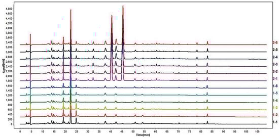 In accordance with the preparation method of ZZHPD under Section 4.2., six ZZHPD samples were prepared in parallel with SZS and TZS, separately. The samples were analyzed by HPLC, and 12 data were obtained. The ZZHPD prepared using TZS was labeled 1-1 to 1-6, and the ZZHPD containing SZS was labeled 2-1 to 2-6. Then, the Analytical Instrument Association (AIA) format of the 12 ZZHPD samples was imported into the “Similarity Evaluation System for Chromatographic Fingerprints of TCM” (Chinese Pharmacopeia Commission, version 2004A) to evaluate the overall similarity of two batches of ZZHPD. The similarity results are shown in Tables S1–3. The similarity between the six samples of each ZZHPD was greater than 0.9, indicating that the parallelism of the sample preparation and the stability of the system were satisfactory []. However, the similarity between the two kinds of ZZHPDs is quite different, indicating that there are significant differences between them. It can be seen in Figure 2 that the ZZHPD prepared with TZS is obviously lacking several peaks compared with SZS.