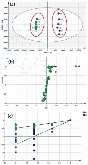 Multivariate statistical analysis of ZZHPD prepared using TZS and SZS. (a) OPLS-DA score plot (TZS is green dots and SZS is blue diamonds); (b) OPLS-DA S-plot (the variable importance in projection (VIP) value of the red diamonds are greater than 1); (c) model validation of the permutation tests.
