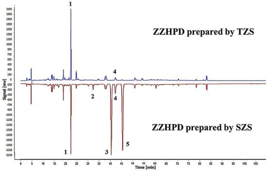Image comparison of HPLC chromatograms between ZZHPD prepared using TZS and SZS (upper is TZS and lower is SZS); peaks 1–5 are the differential compounds identified.
