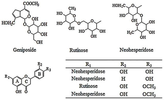 In order to obtain the comprehensive characteristic of the differential compounds in ZZHPD, the screened differential peaks were analyzed using the LC–MS method under Section 4.5. The molecular formulas were calculated by high-accuracy quasi-molecular ions, such as [M + H]+, [M + Na]+, [M + CH3COO]−, and [M − H]−, within a mass error of 10 ppm. Then, the most reasonable molecular formula was searched in the previously reported ZZHPD compounds. The fragment ions obtained by HPLC-TOF/MS and/or HPLC-QqQ-MS/MS further confirmed the chemical structures of the compound, and ultraviolet (UV) absorption was also another important piece of evidence for speculating the type of compound. As a result, five compounds, namely geniposide, neoeriocitrin, naringin, hesperidin, and neohesperidin, were tentatively identified (Figure 5). The relevant identification information of the HPLC-TOF/MS and HPLC-QqQ-MS/MS in a positive or negative ion mode is listed in Table 1.