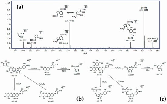 Both peaks 4 and 5 produced molecular ion peaks of [M + H]+ m/z 611, which should be a group of isomers. As seen in Figure 6b,c, [M + H]+ m/z 611 loses a neutral molecule, C6H10O4, to generate m/z 465, or loses a C6H10O5 to form m/z 449. When it loses a C12H20O9 neutral molecule to form m/z 303, m/z 303 will further lose a C9H10O2 to form m/z 153, because of the RDA reaction. Its cleavage pathway is consistent with the reported hesperidin and neohesperidin pathways []. As the retention time of hesperidin is shorter in reversed-phase chromatography, peaks 4 and 5 are recognized as hesperidin and neohesperidin, respectively.