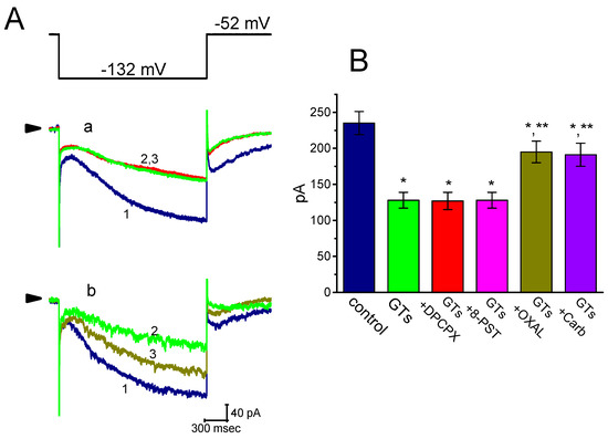 2.4. Comparisons Among the Effects of GTs, GTs Plus 8-Cyclopentyl-1,3-dipropylxanthine (DPCPX), GTs Plus 8-(p-Sulfophenyl)theophylline (8-PST), GTs Plus Oxaliplatin (OXAL) and GTs Plus Carboxiplatin (Carb) in Ih Amplitude