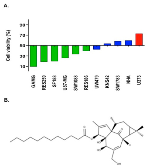 Chemical structures of modified ingenol derivative. (A) Cytotoxicity profile of 10 glioma cell lines and one normal human astrocyte exposed to IngC compound. Bars represent the cell viability at 10 μM of IngC. Colors represent the GI score classification: Green (HS = Highly Sensitive); Blue (MS = Moderate Sensitive) and Orange (R = Resistant). (B) ingenol-3-dodecanoate (IngC). http://www.chemspider.com/Chemical-Structure.28533061.html.