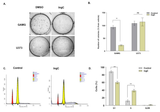 Effect of IngC in colony formation of glioma cells. (A) U373 and GAMG cells were seeded and grown in soft-agar medium containing the indicated compounds. (B) The number of colonies in each well was counted after 20 days of IngC treatment. The graphs are representative of at least two independent experiments performed in duplicate. n.s. means non-significant. (C) U373 cells (untreated and cells treated with IngC) were incubated for 72 h. Next, U373 cells were fixed with ethanol, stained with propidium iodide and cell cycle phase was analyzed by flow cytometry. (D) Results shown are the means ± S.D. of three independent experiments. n.s. means non-significant. ** p < 0.005.