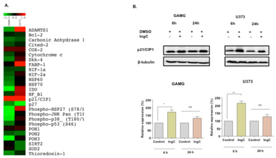 Effect of IngC on cell stress and cell cycle distribution on glioma cell lines. (A) A panel of 26 proteins related to cellular stress. Data represented by the heat maps show the proteins modulated after 6 h of IngC treatment (3X IC50 value) in glioma cells, GAMG and U373. The quantification and normalization of proteins was performed using the positive controls and untreated controls from the package Protein Array Analyzer of Image J software. (B) Cells were treated with IC50 concentrations of IngC (6 and 24 h) for the indicated time periods. GAMG and U373 cell lysates (20 μg per lane) were analyzed using immunoblotting with anti-p21/cip1. The tubulin was used as an internal control to normalize the amount of proteins applied in each lane. These data are representative of three independent experiments. n.s. means non-significant. * p < 0.05 and ** p < 0.005.