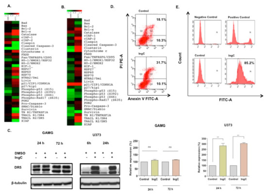 Effect of IngC on apoptosis pathway on glioma cell lines. (A,B) Panel of 35 proteins related to apoptosis. The data represented by the heat maps show the proteins modulated after 24 and 72 h of IngC treatment (3X IC50 value (13.09 μM) in glioma cells, GAMG and U373. (C) Cells were treated with 3X IC50 concentrations of IngC (24 and 72 h) for the indicated time periods. GAMG and U373 cell lysates (20 μg per lane) were analyzed using immunoblotting with anti-DR5. The tubulin was used as an internal control to normalize the amount of proteins applied in each lane. This data is representative of three independent experiments. (D) After the IngC treatment with 3X IC50 for 72 h, U373 cells were fixed, stained with annexin V-FITC/PI and analyzed by FACScan. Data shown are representative of three independent experiments. (E) After IngC treatment with 3X IC50 for 72 h, DNA fragmentation in U373 cell line was measured with the TUNEL assay using flow cytometry. The graphs are representative of at least three independent experiments performed in duplicate. n.s. means non-significant. ** p < 0.005