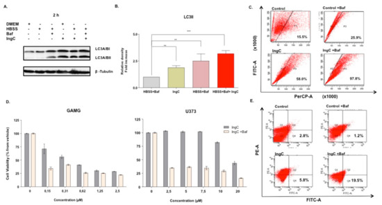IngC promotes autophagy on glioma cells. (A) Cells were treated with the IC50 value of IngC for the indicated time periods. GAMG cell lysates (20 μg per lane) were analyzed using immunoblotting with anti-LC3. (A,B) are representative of three independent experiments with GAMG. Tubulin was used as an internal control to normalize the amount of proteins applied in the treatment without bafilomycin A1 (Baf). (C) Development of AVO in IngC-treated cells by detecting green and red fluorescence in acridine orange-stained cells using FACS analysis. U373 cells were treated with IngC (IC50 value), and Baf (20 nM) for 72 h. The graphs are representative of at least two independent experiments. FITC indicates green color intensity, while PerCP shows red color intensity. (D) Effect of baf on GAMG and U373 cell viability of IngC-treated cells. At 3 h after exposure to IngC, baf was added and cultured until 72 h and evaluated by MTS assay. The viability of the untreated cells was considered as 100%. Results shown are the means ± S.D. of three independent experiments. (E) Effect of Baf on IngC-induced apoptosis. After, IngC and bafilomicyn treatment for 72 h, GAMG cells were stained with annexin V-FITC/PI and analyzed by FACScan. Data shown are representative of three independent experiments. ** p < 0.005 and *** p < 0.0001